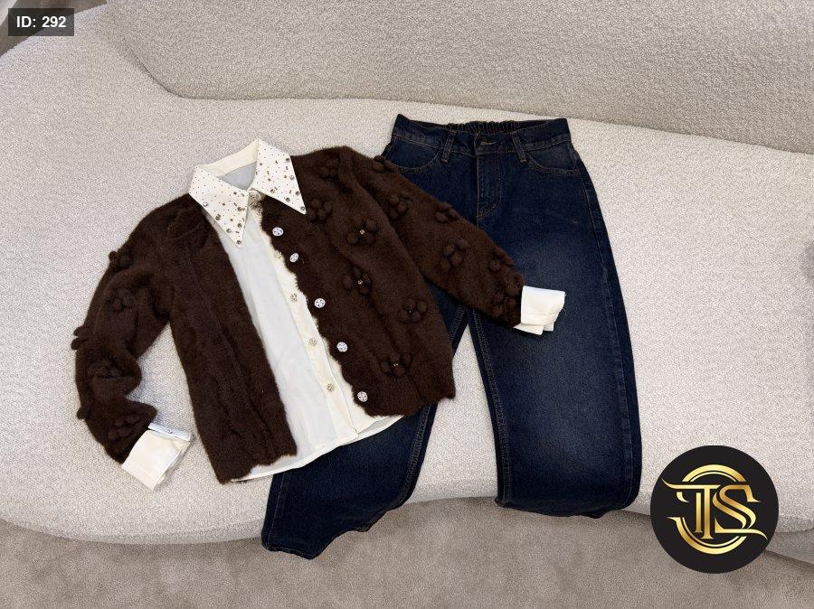 جاكيت شتوي بلون بني غني بخامة ناعمة وراقية مزينة بتفاصيل بارزة تعطي لمسة فخامة، مع قميص داخلي أبيض بياقة مميزة منقطة تضيف نعومة وأناقة للتصميم، وبنطلون جينز داكن بقصّة مرتبة تكمل الإطلالة بأسلوب عصري
