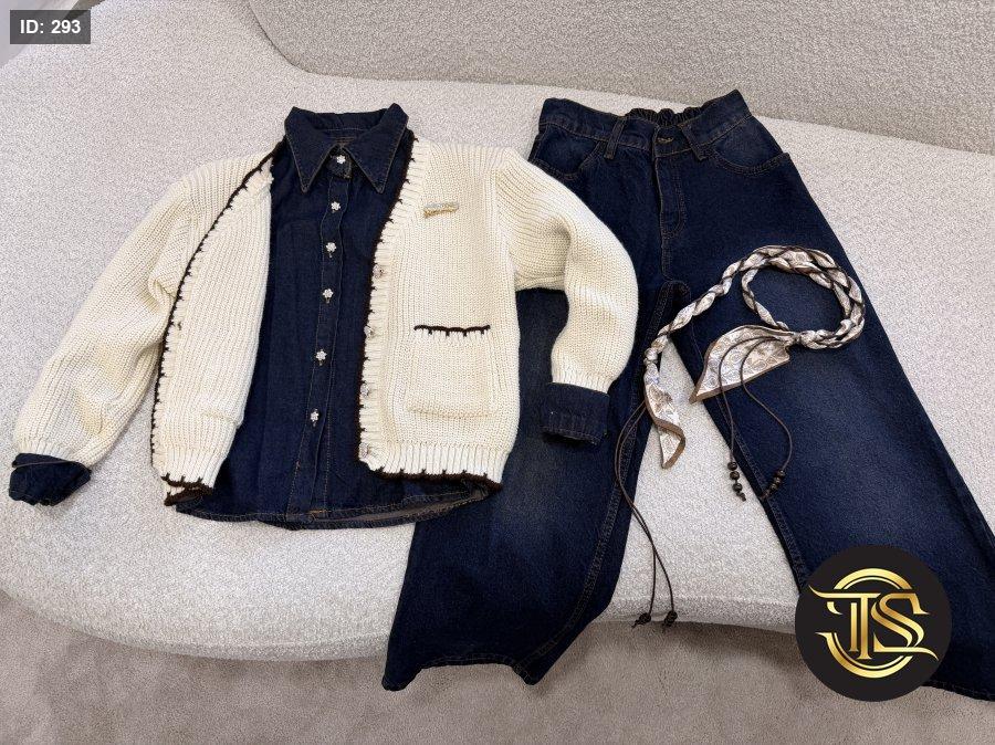 قميص جينز داكن بقصّة مرتبة وأزرار ناعمة، مع كارديغان صوفي بلون أوف وايت دافئ بتفاصيل دقيقة ولمسة أنثوية أنيقة، وبنطلون جينز داكن بقصّة مريحة وعملية.