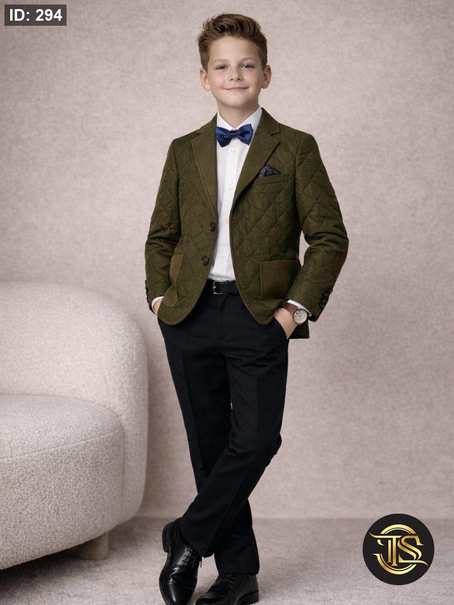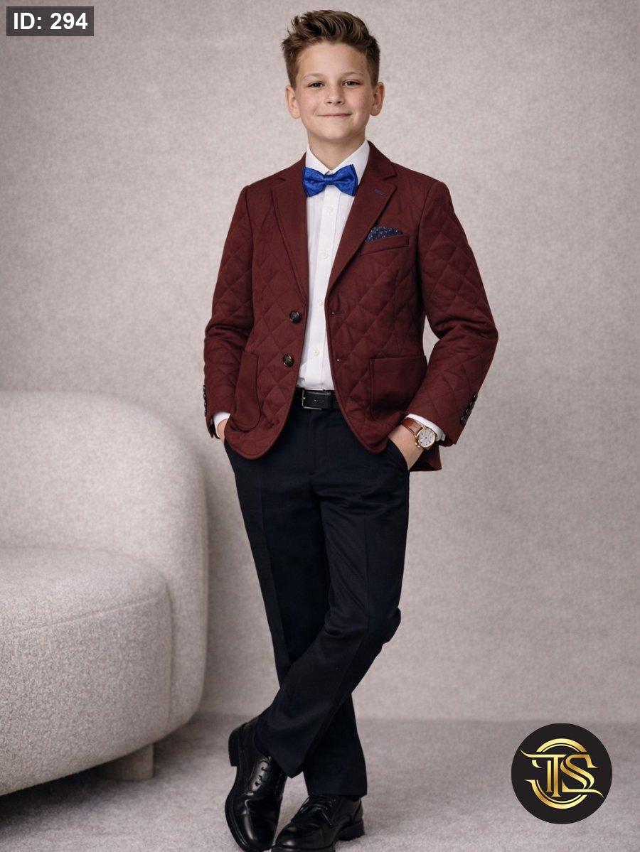 قاط سبورت أنيق للأطفال بتصميم عصري يجمع بين الفخامة والراحة، يتكوّن من جاكيت مبطّن بنقشة مربعات باللون النبيذي الغامق، مع قميص أبيض كلاسيكي وربطة عنق بابيون باللون الأزرق تضيف لمسة راقية.