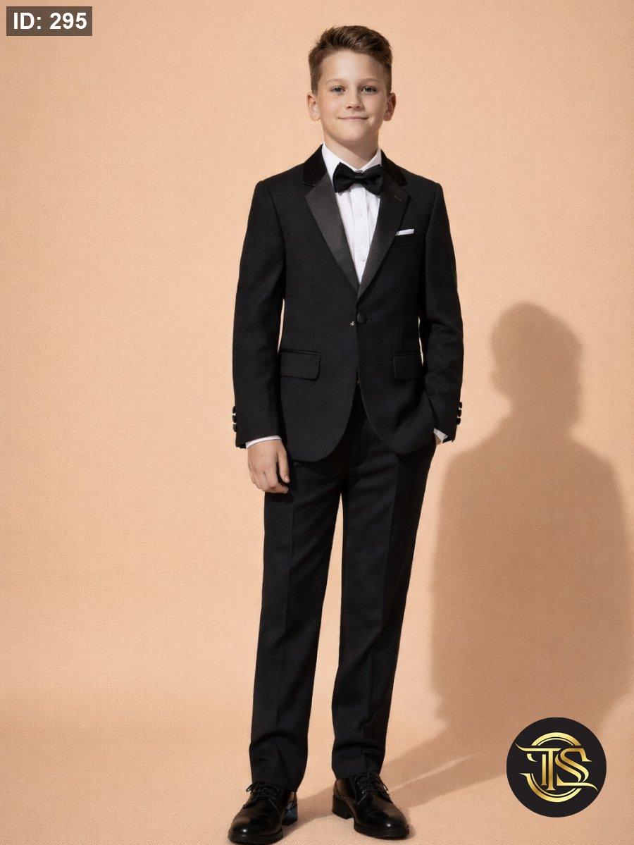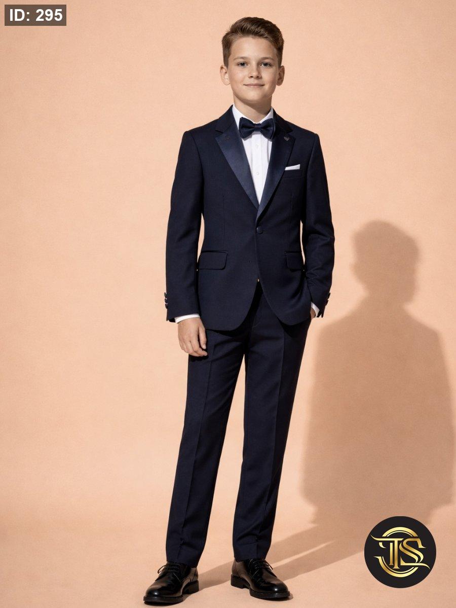 قاط رسمي راقٍ بتصميم كلاسيكي أنيق، يتكوّن من جاكيت وبنطال وقميص مع بابيون بلون كحلي داكن يمنح إطلالة فخمة
