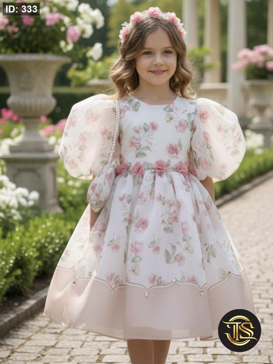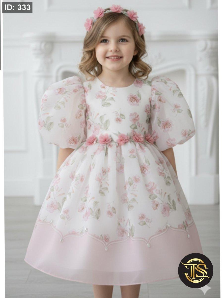 فستان بتدرجات الوردي الهادئ مع طبعة فيونكات ناعمة، وأكمام منفوشة تعطي فخامة مميزة