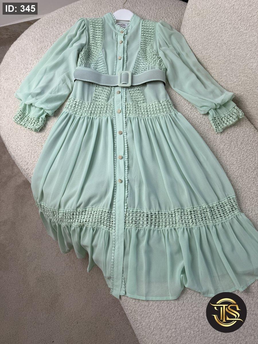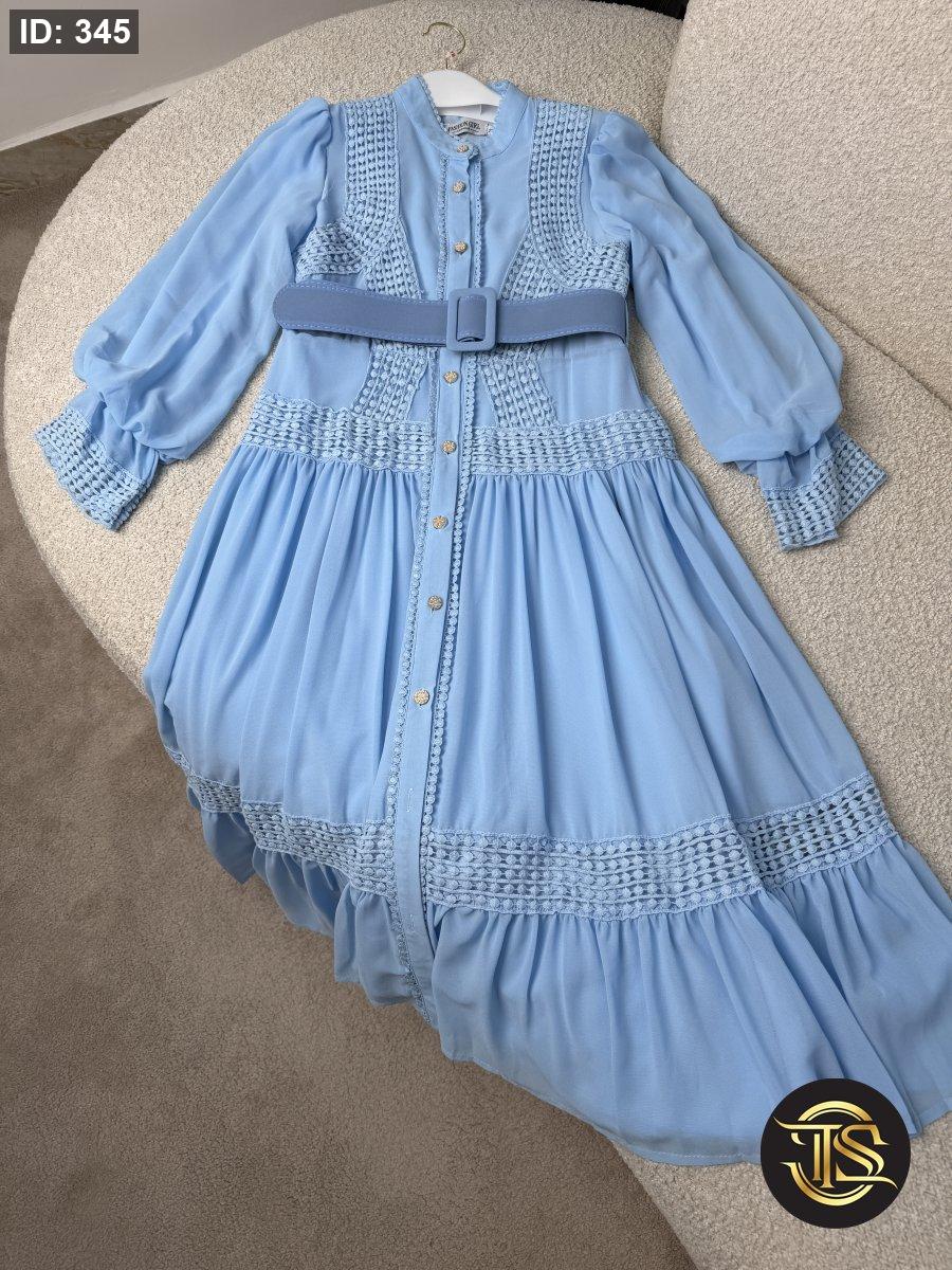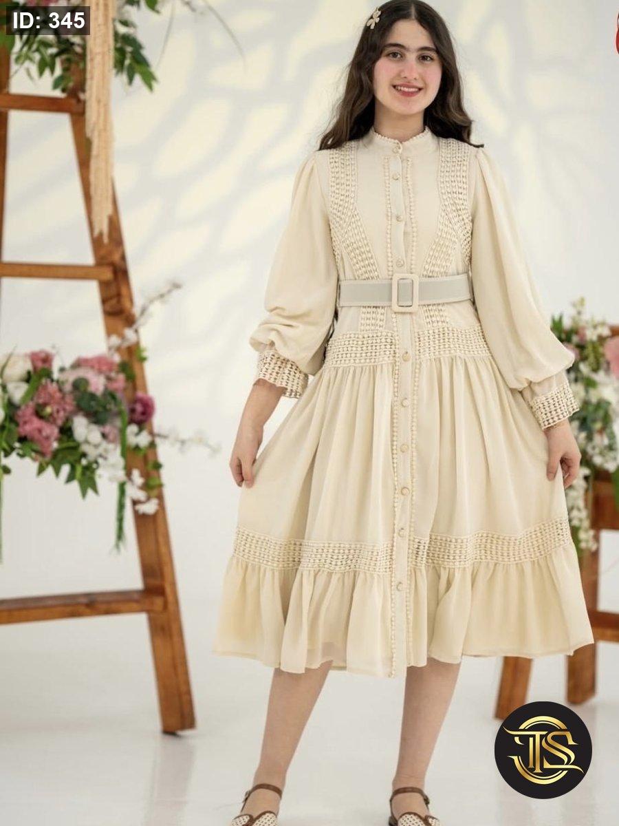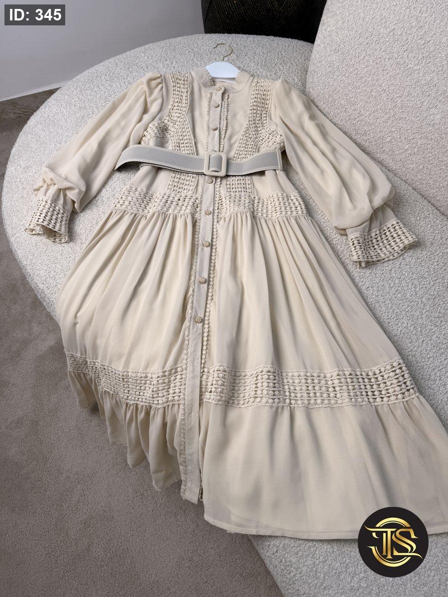 تصميم أنيق بطبقات كشكش مرتبة ولمسات دانتيل فاخرة على الصدر والمنتصف تعطيه طابع كلاسيكي مميز 💛